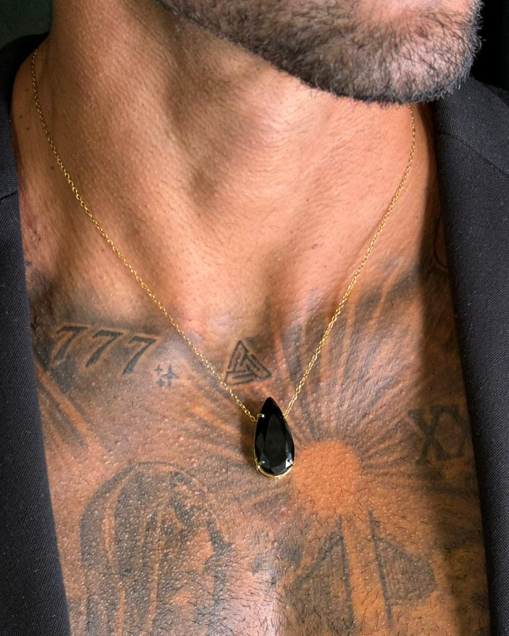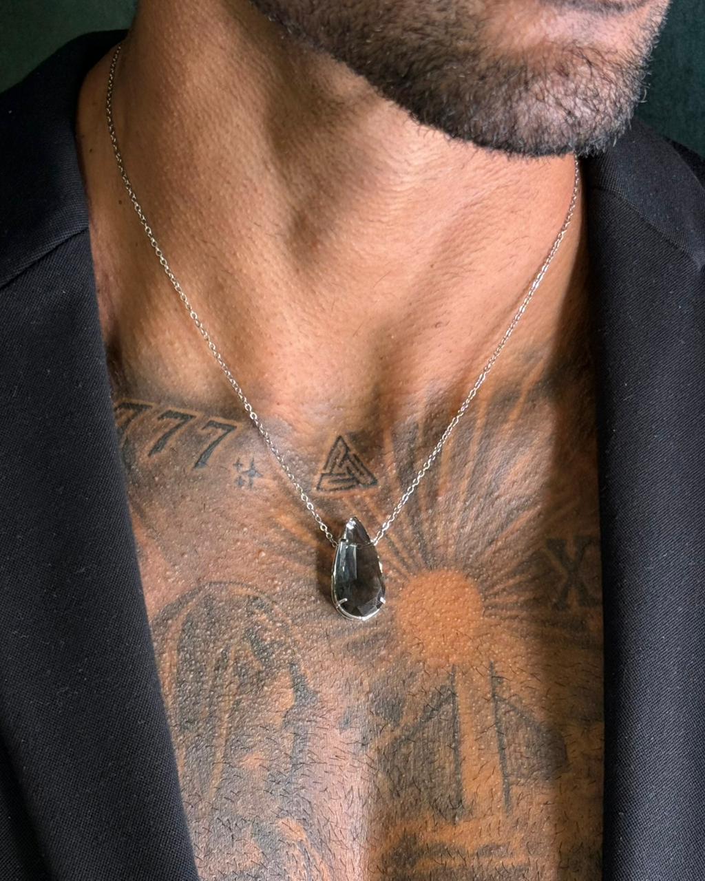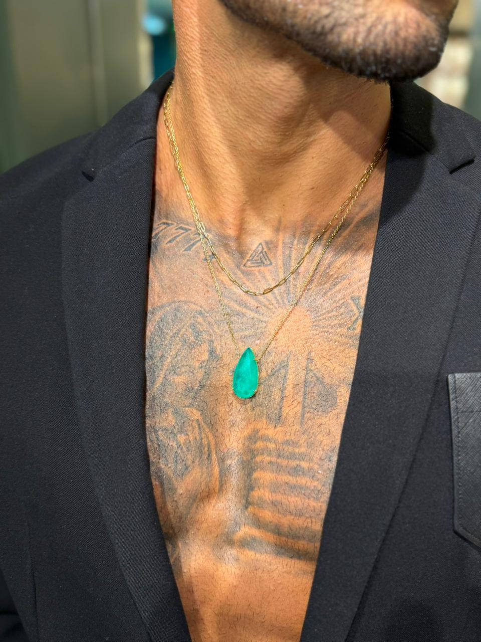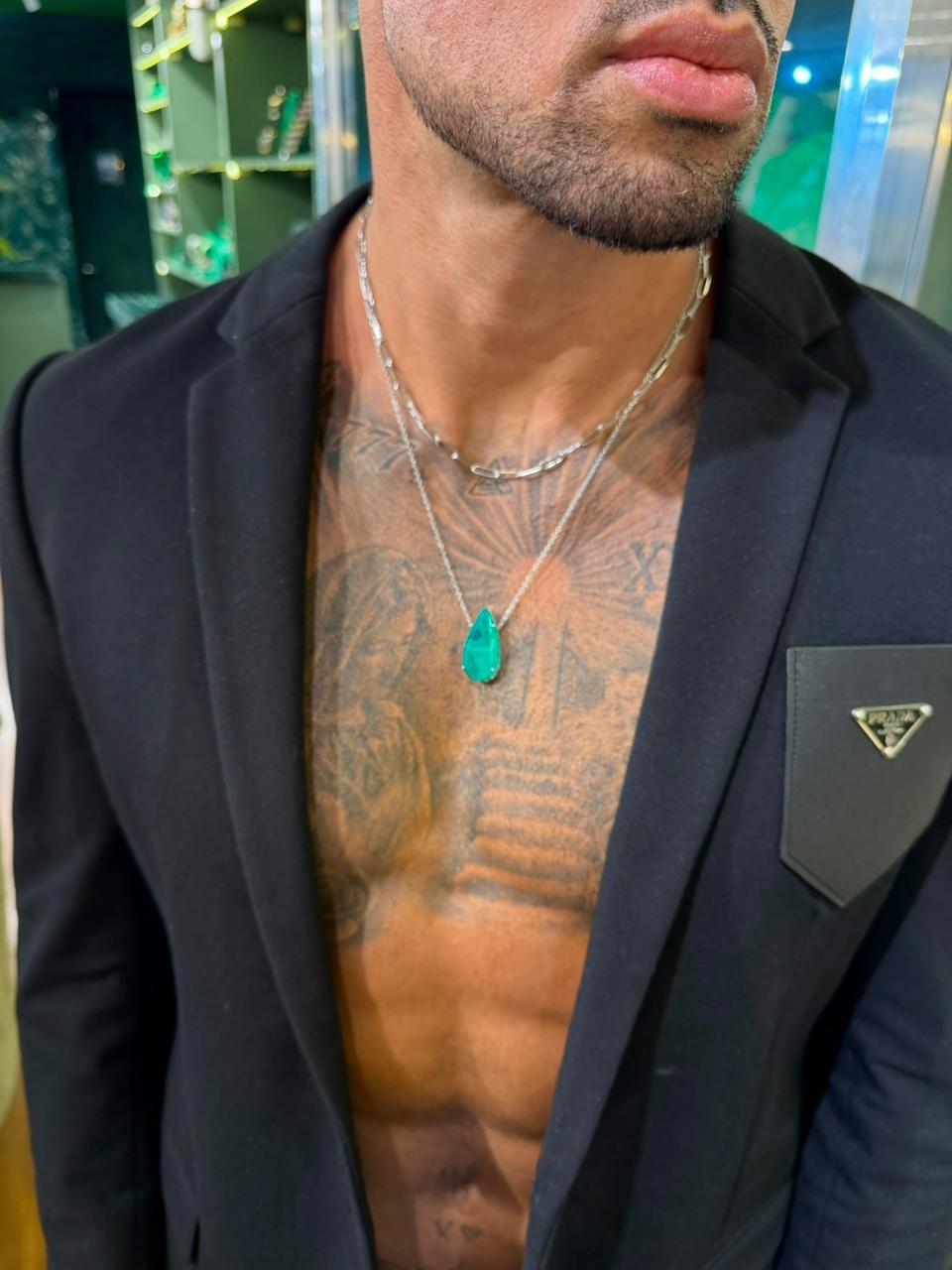 A composição une o destaque da gota grande em pedra lapidada — imponente e sofisticada — com o colar liso, que traz equilíbrio e versatilidade ao conjunto. O resultado é um look refinado, masculino e fácil de combinar, perfeito para o dia a dia ou ocasiões especiais.