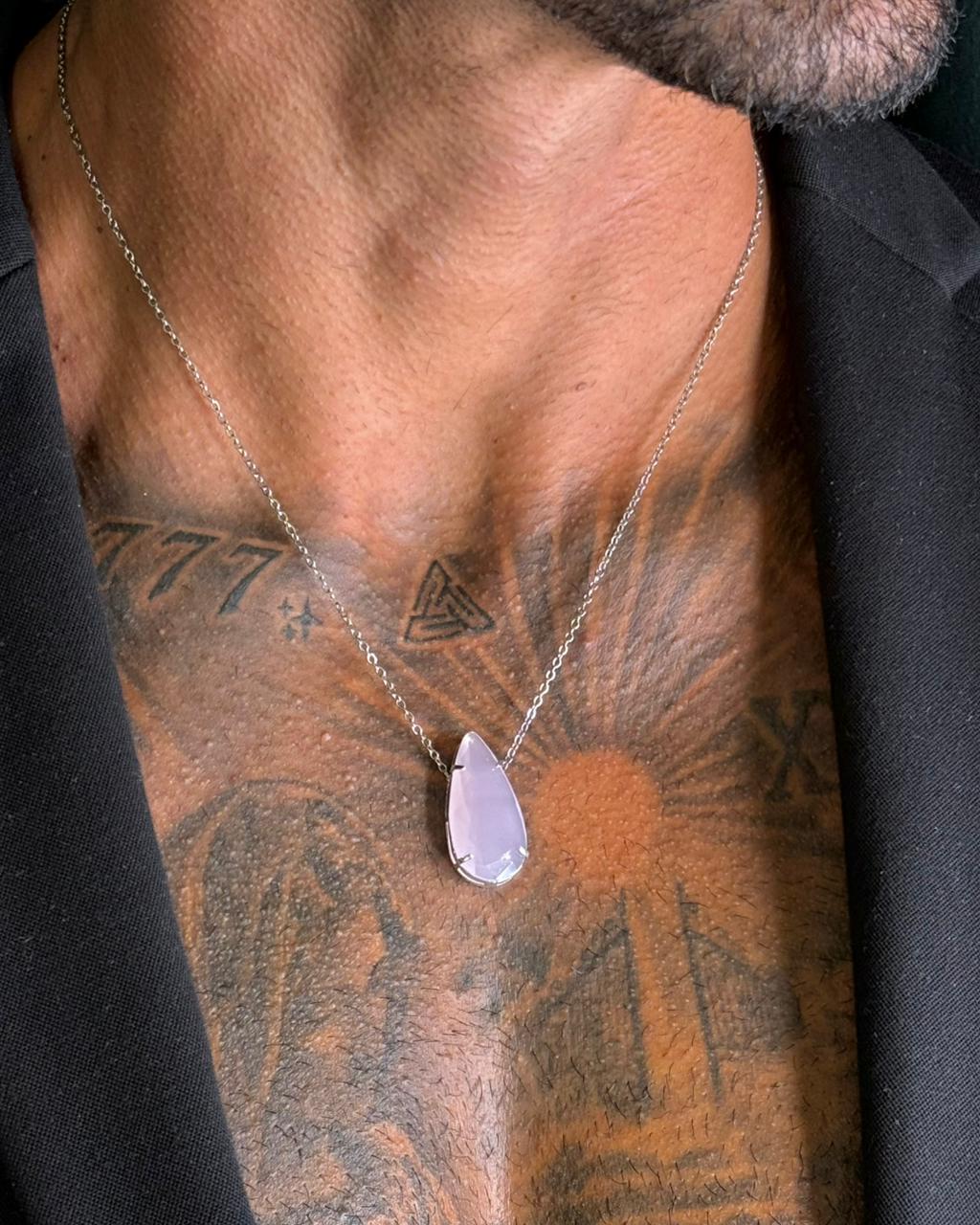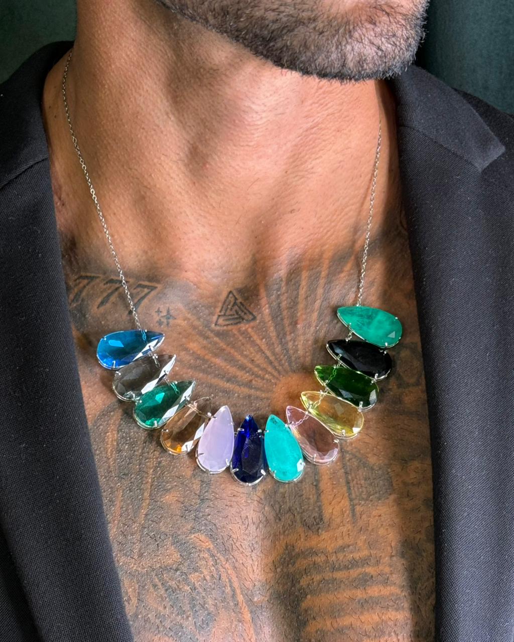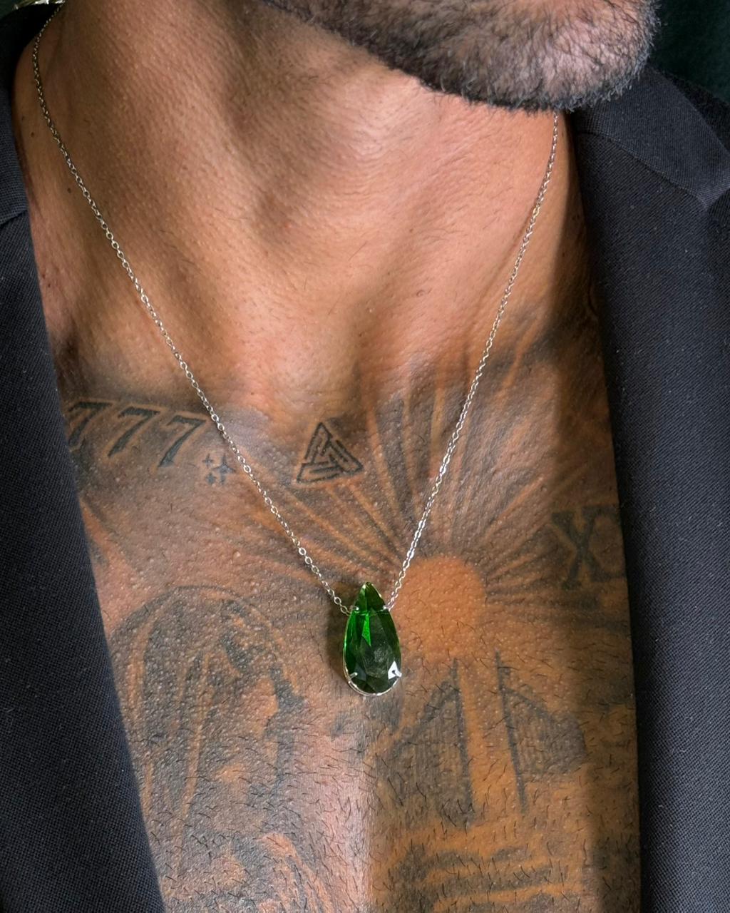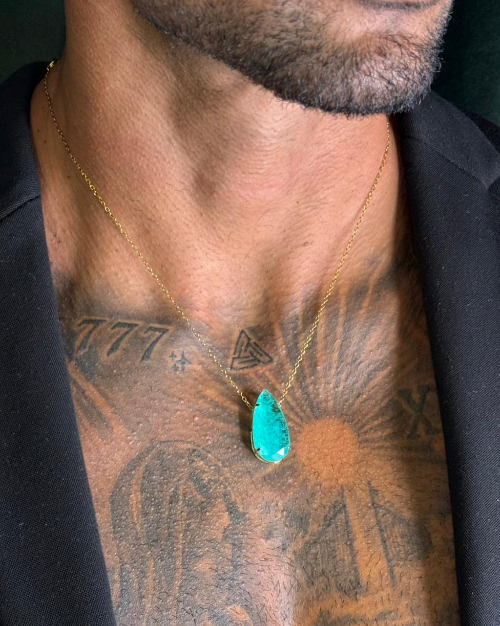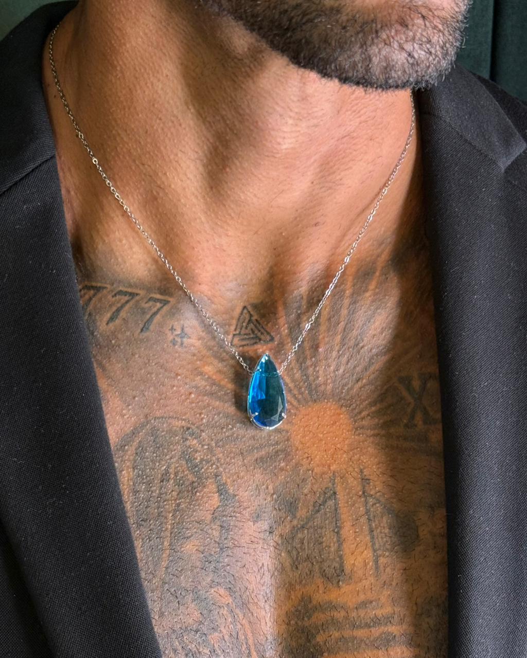 A composição une o destaque da gota grande em pedra lapidada — imponente e sofisticada — com o colar liso, que traz equilíbrio e versatilidade ao conjunto. O resultado é um look refinado, masculino e fácil de combinar, perfeito para o dia a dia ou ocasiões especiais.