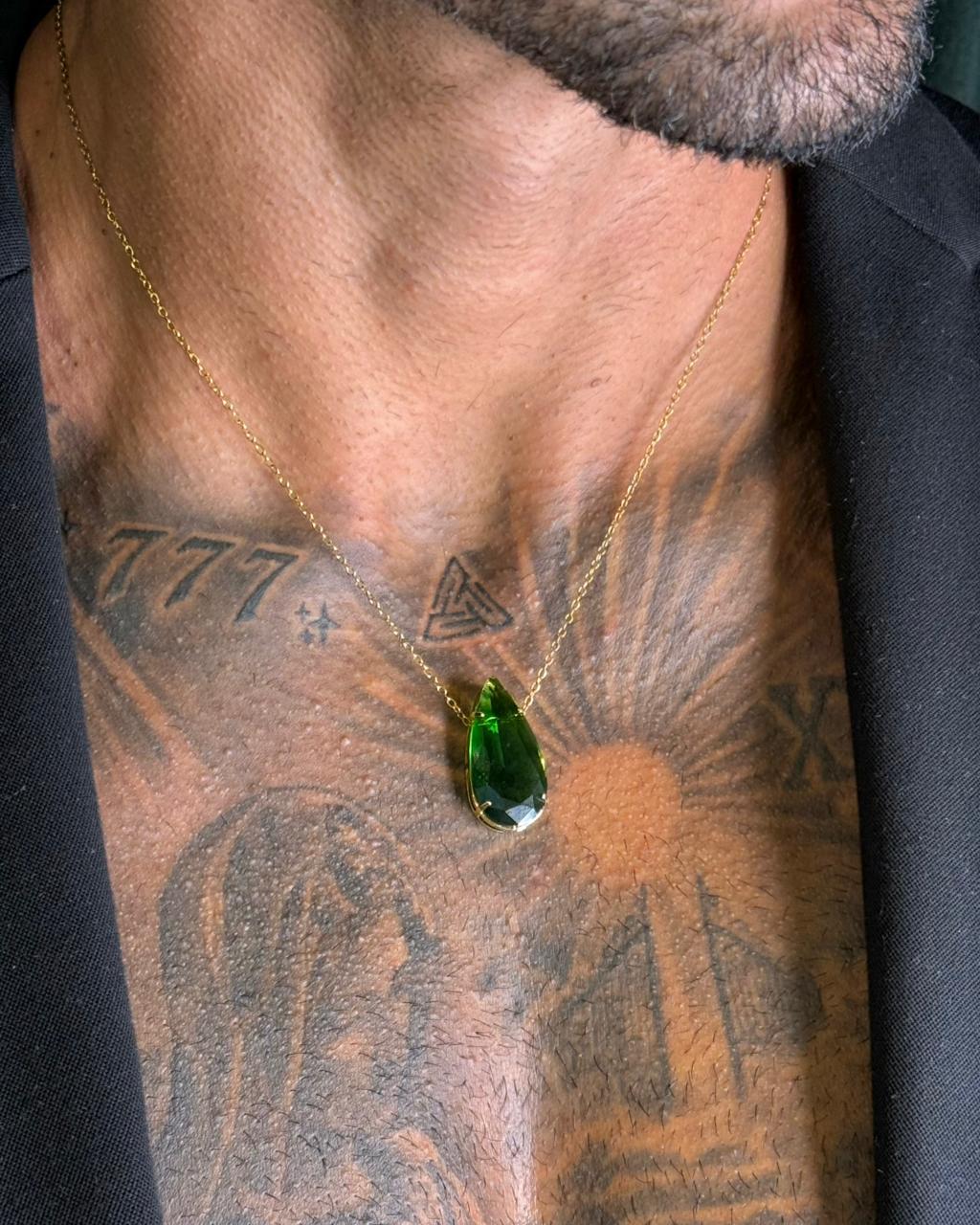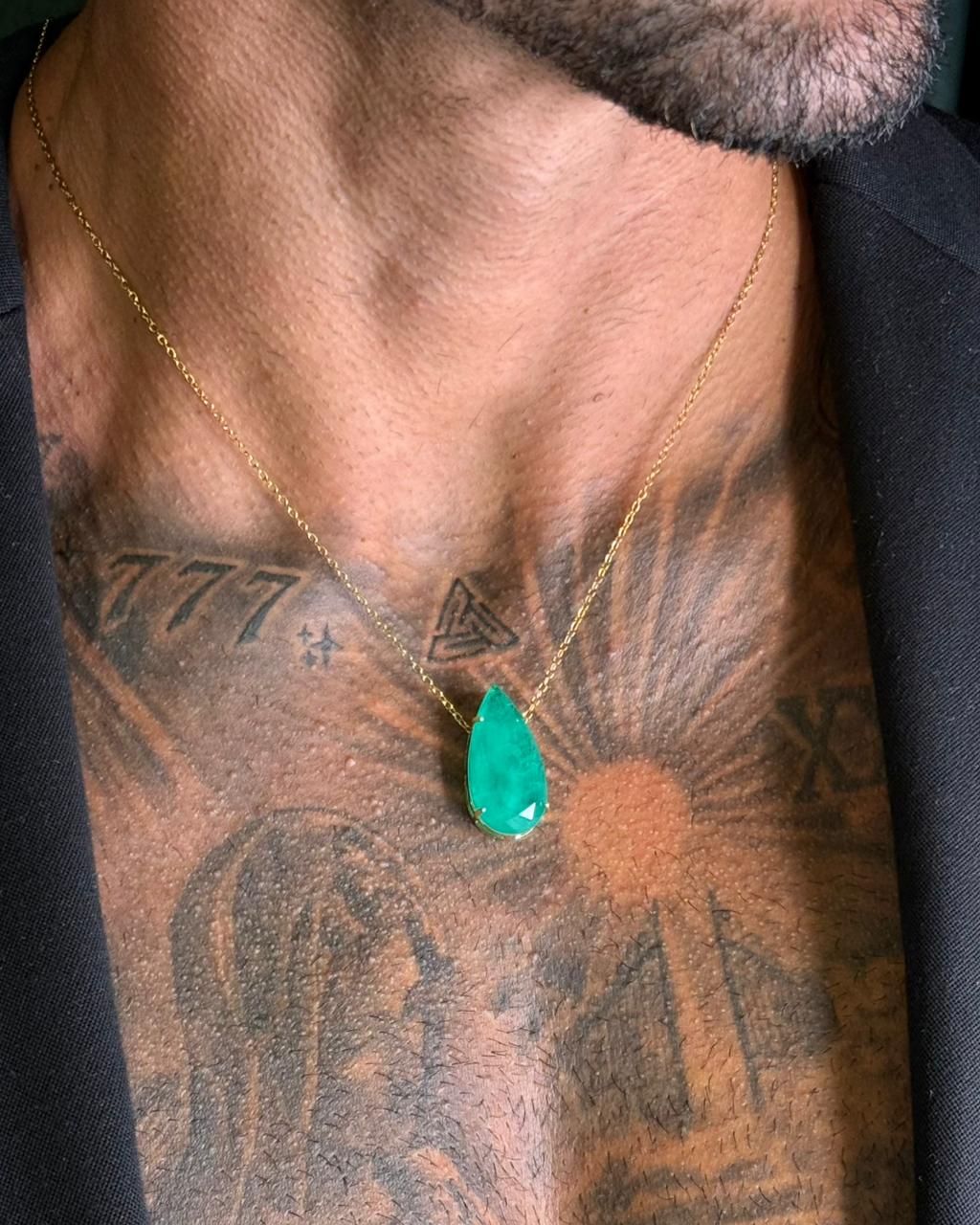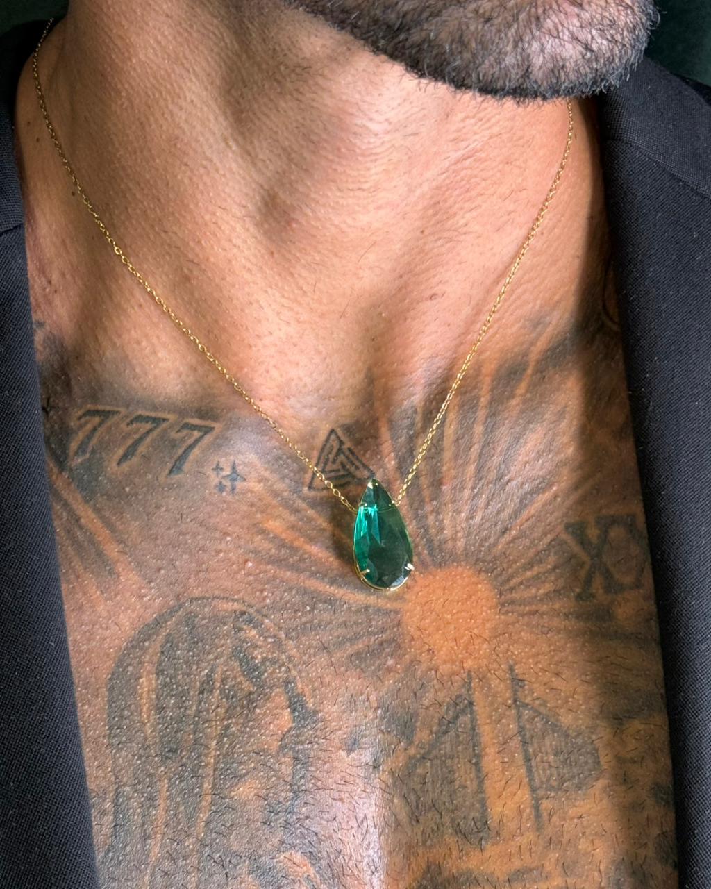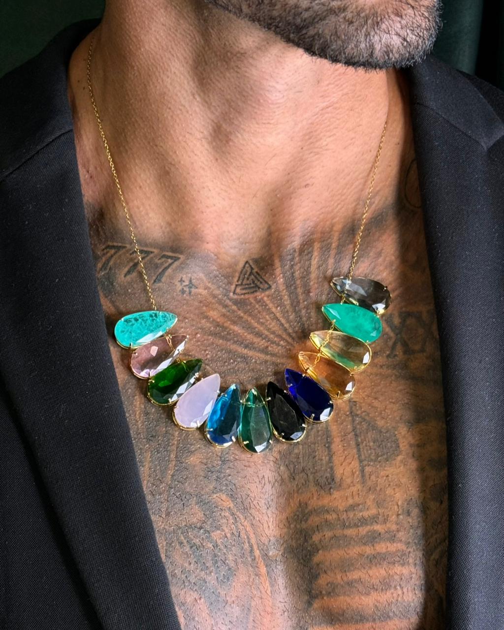 A composição une o destaque da gota grande em pedra lapidada — imponente e sofisticada — com o colar liso, que traz equilíbrio e versatilidade ao conjunto. O resultado é um look refinado, masculino e fácil de combinar, perfeito para o dia a dia ou ocasiões especiais.