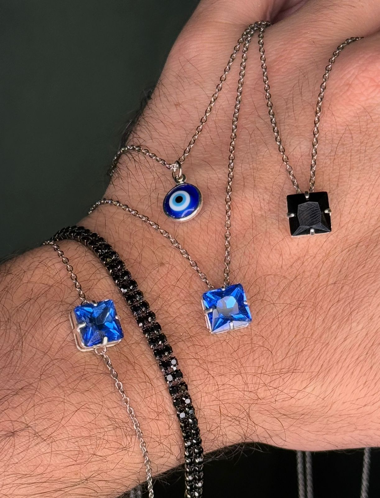 Kit especial composto por 5 peças, sendo essas 3 colares e 2 pulseiras. As peças variam entre aço e semijoia banhadas em ródio (prateado), cravejados com zircônias de primeira linha.
