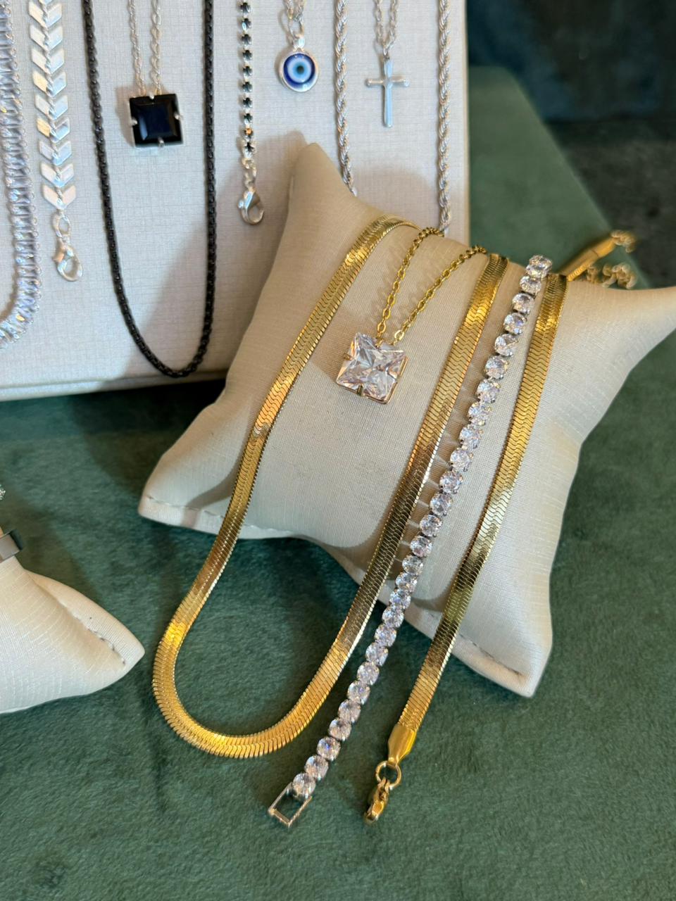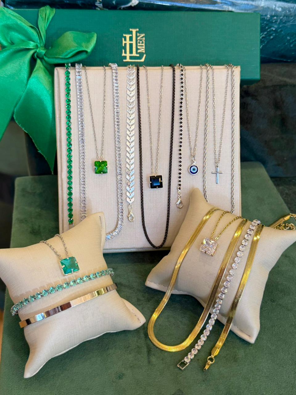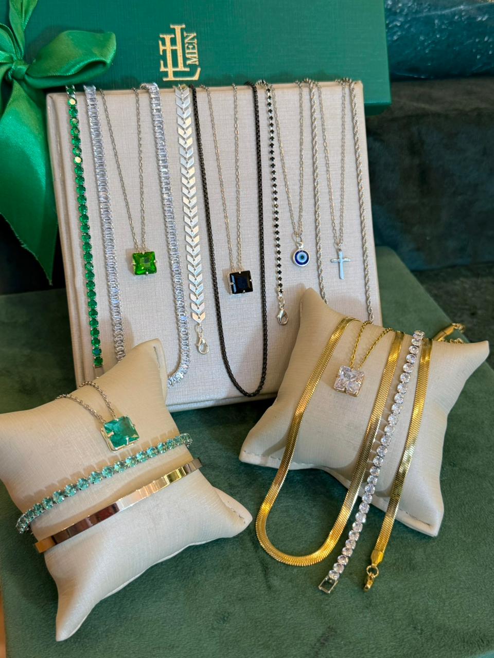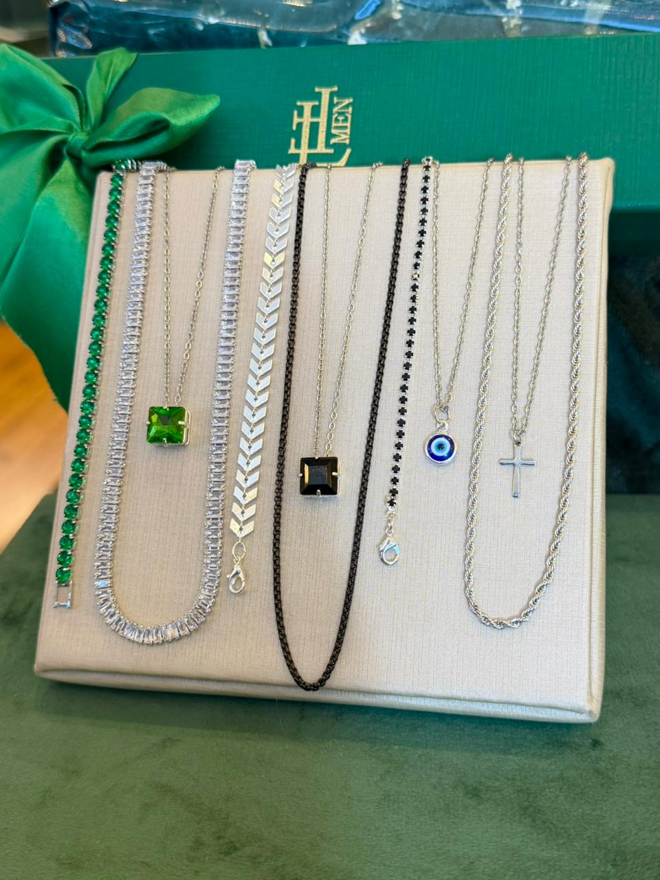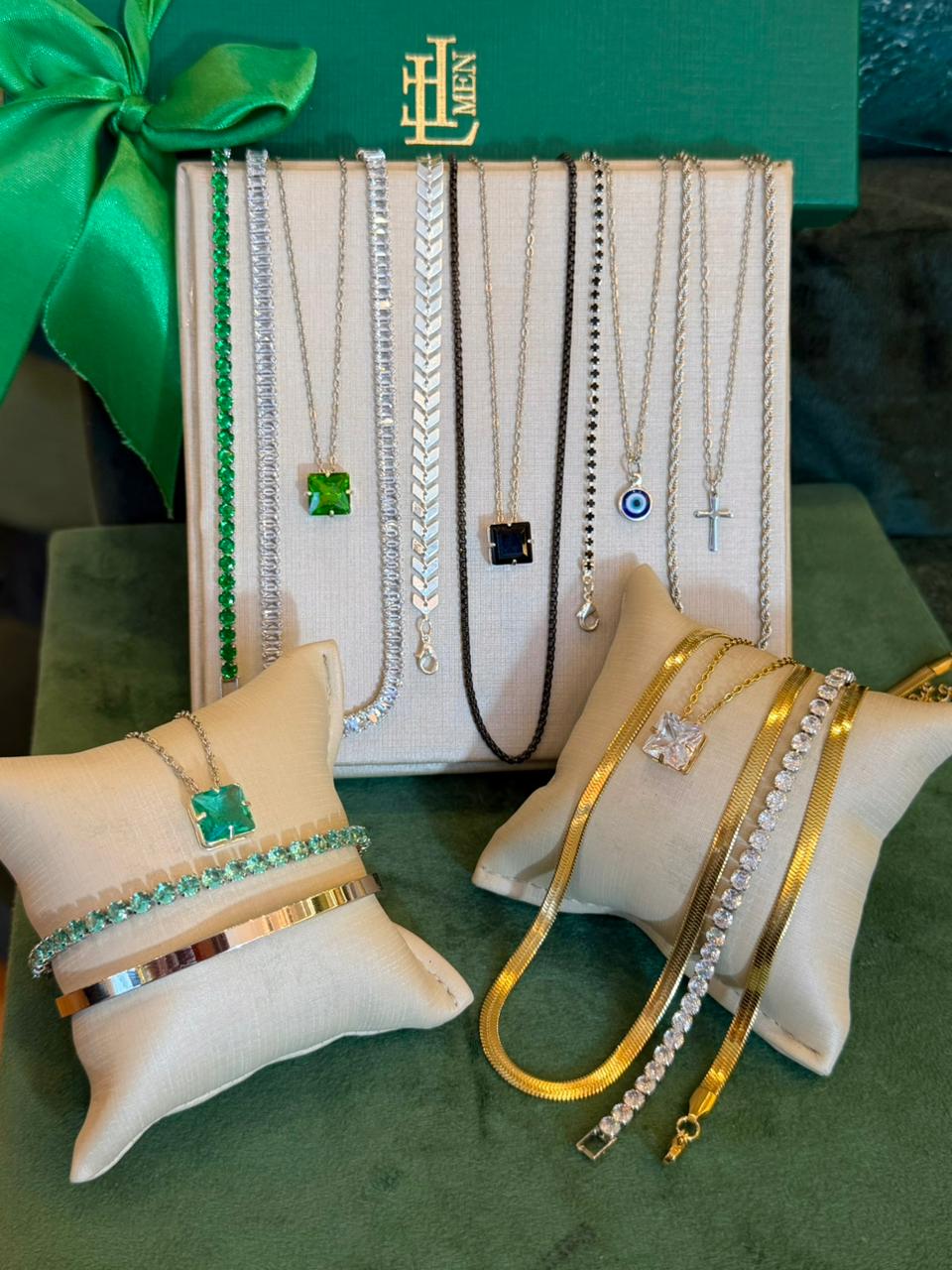Este kit vai com 17 peças sendo 10 colares e 7 pulseiras. Com peças em aço e semijóias banhadas em ródio ou em ouro18k, e cravejadas com zircônias de primeira linha.