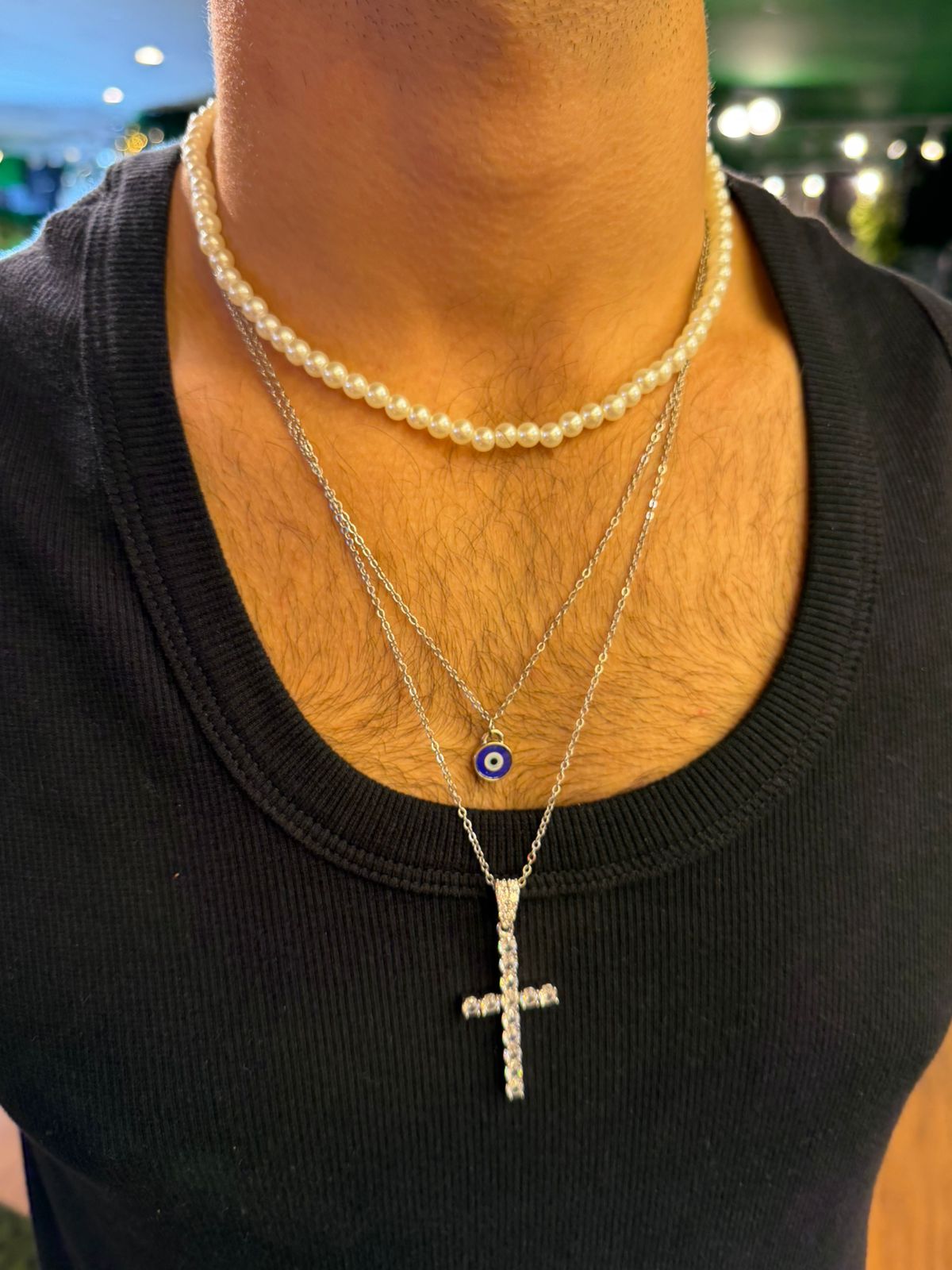 Kit especial com colar de pérolas artificiais + colar de cruz cravejado com zircônias + colar olho grego