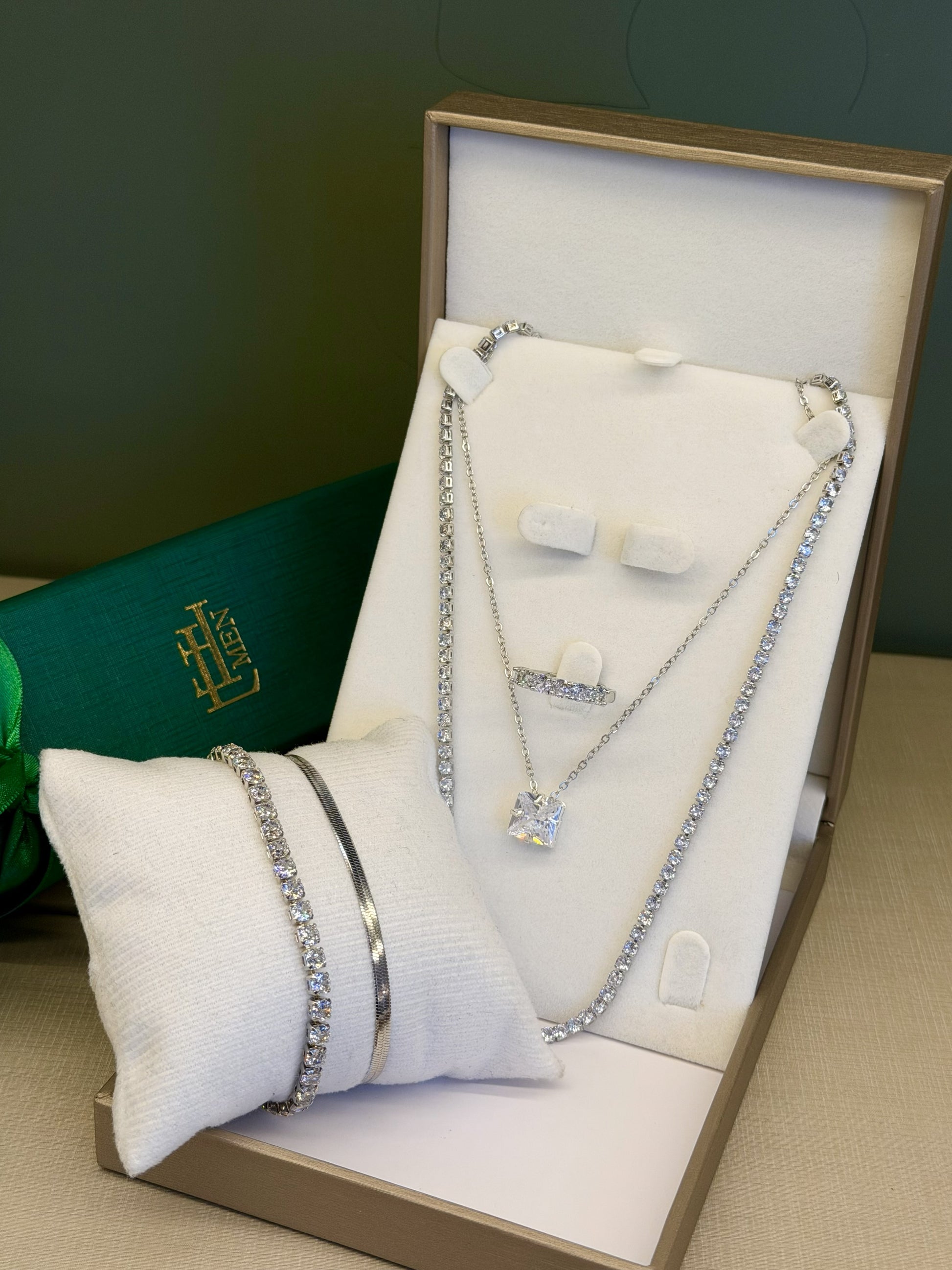 Este kit vai com 5 peças sendo 2 colares, 2 pulseiras e 1 anel ajustável.