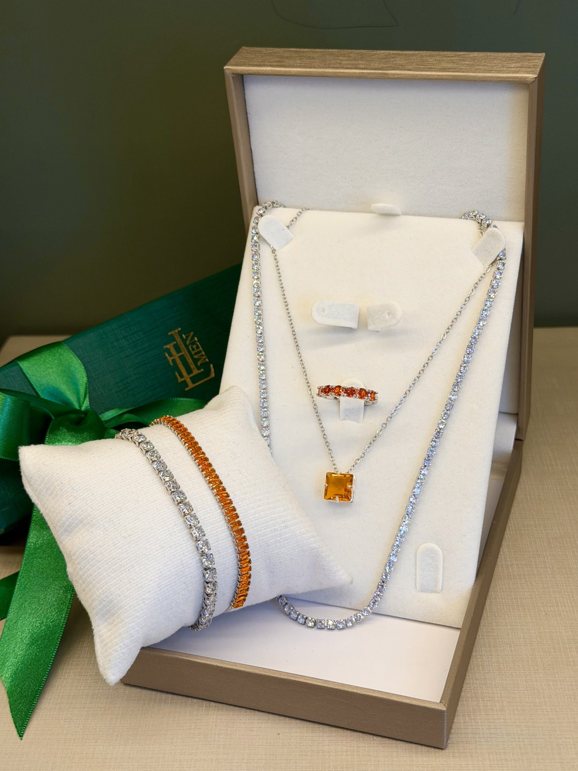 Este kit vai com 5 peças sendo 2 colares, 2 pulseiras e 1 anel ajustável.