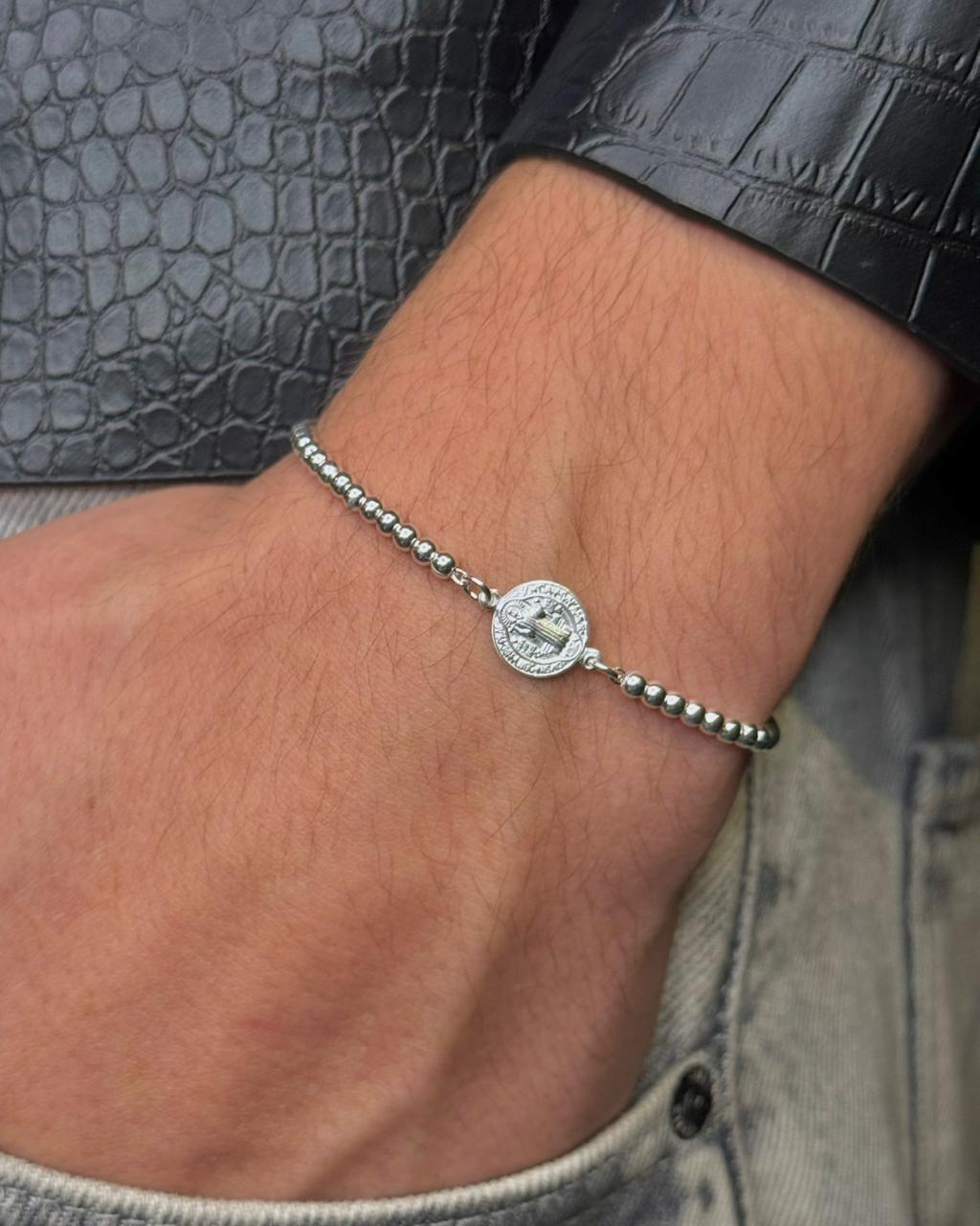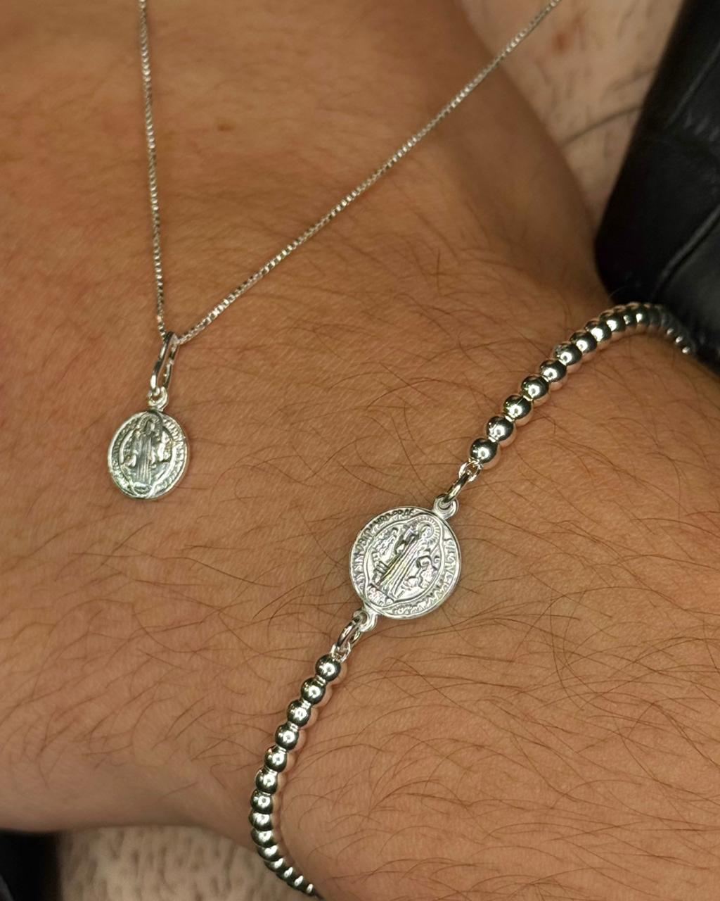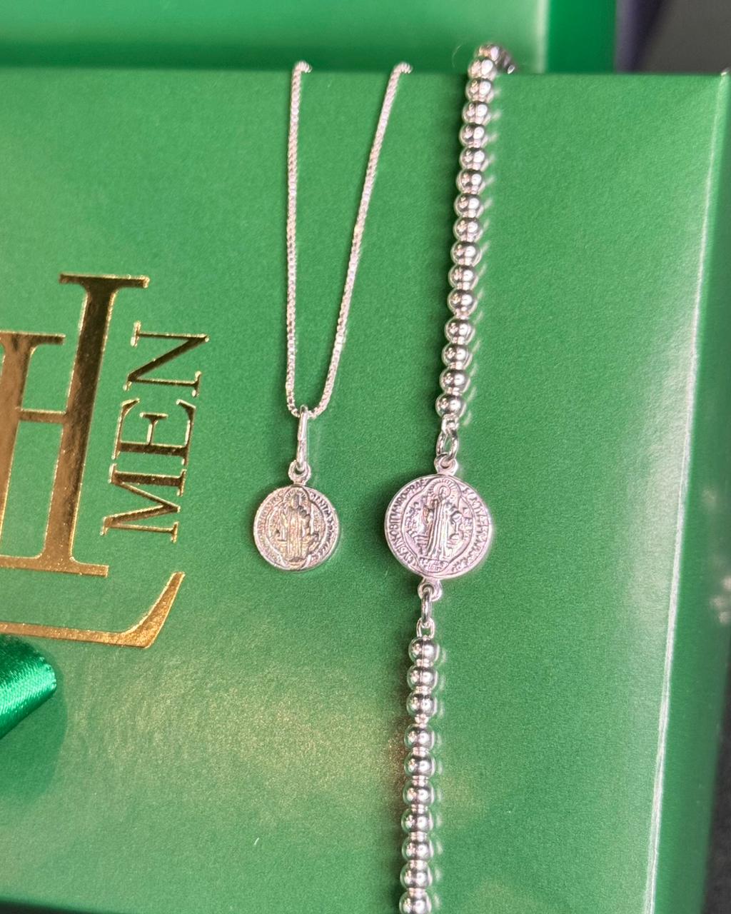Kit especial composto por duas peças, sendo uma pulseira e um colar, ambos com pingente de São Bento. Peças em prata 925.
