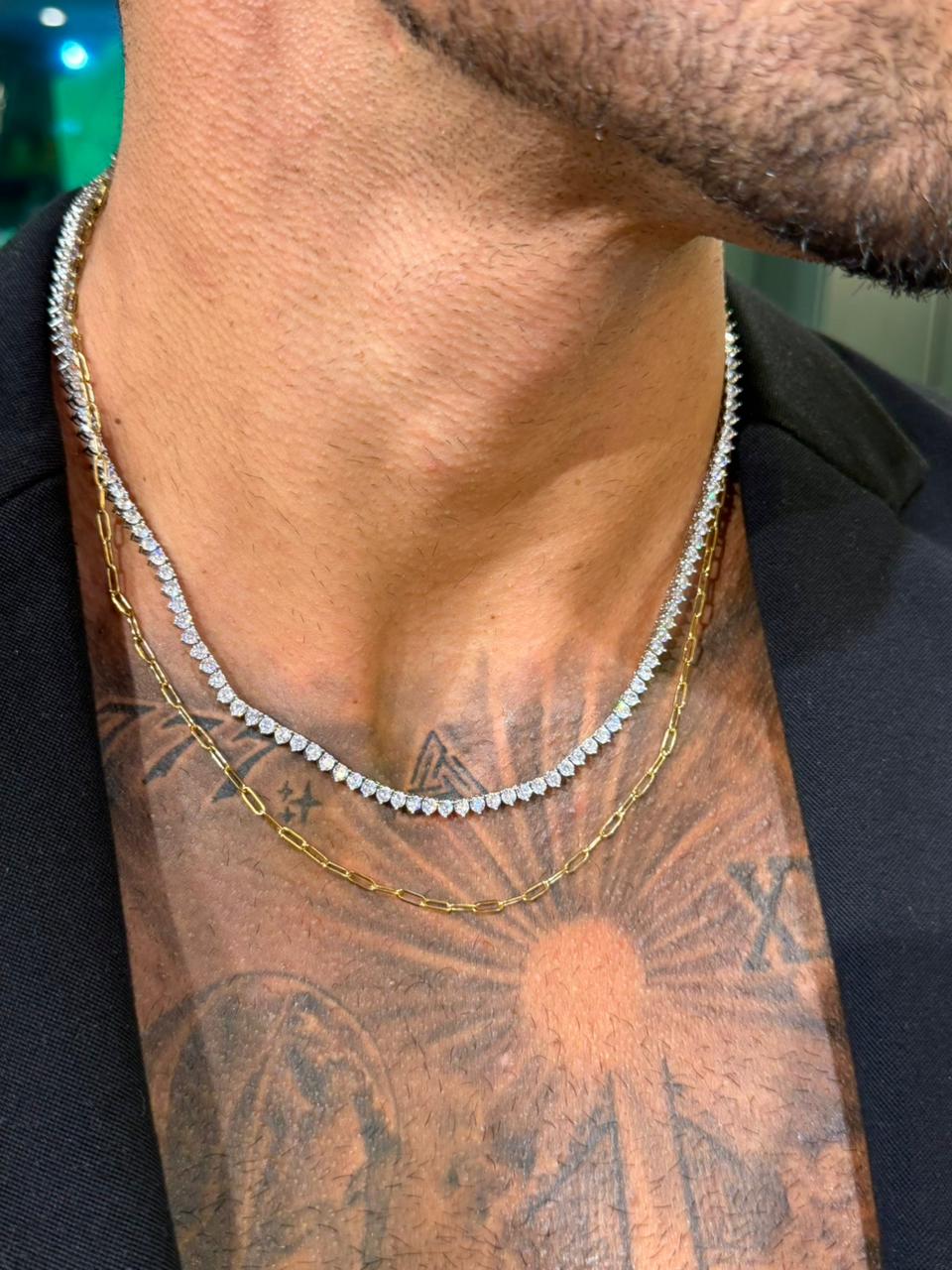 A riviera de brilho contínuo traz o toque de luxo que transforma o visual, enquanto o colar liso completa a composição com elegância minimalista. Juntos, formam um conjunto moderno, refinado e fácil de combinar, ideal para criar camadas sofisticadas ou usar de forma mais clean.