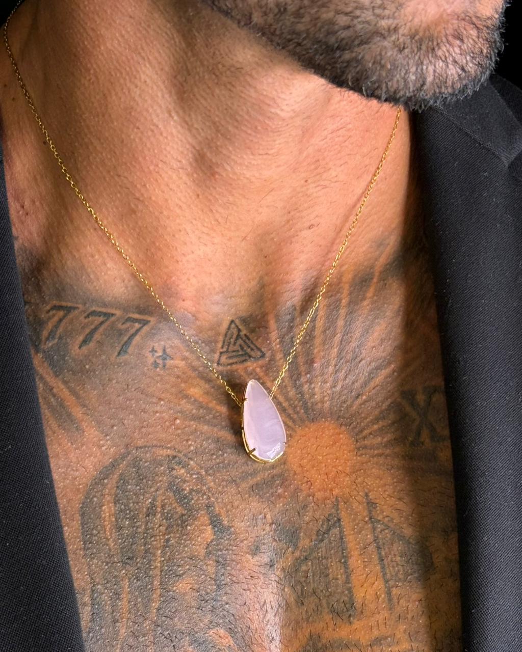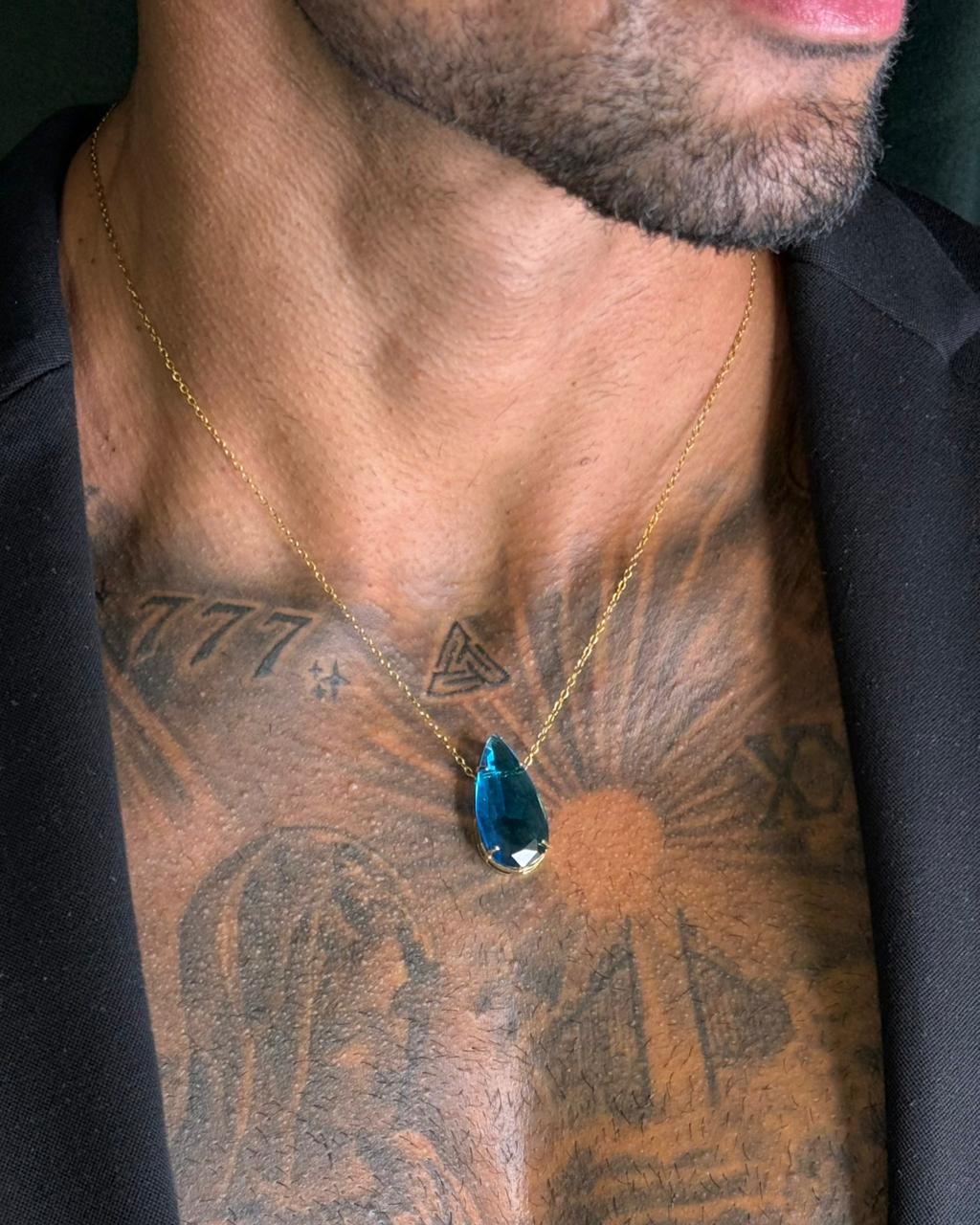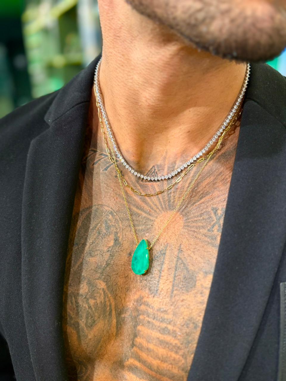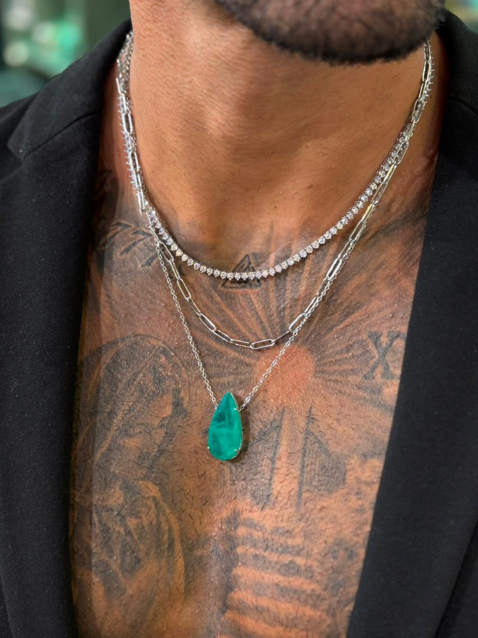 A composição une a elegância atemporal da riviera de brilho contínuo com a imponência do colar de gota grande em pedra lapidada, criando um visual marcante, moderno e extremamente refinado. O terceiro colar liso completa o conjunto com equilíbrio perfeito, ideal para criar camadas elegantes que elevam qualquer look.