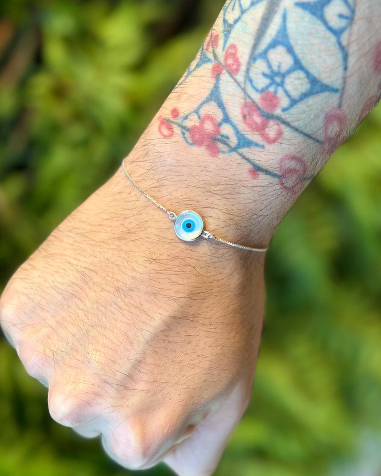 Pulseira modelo veneziana em prata 925, composta por pingente de olho grego circular em madrepérola.